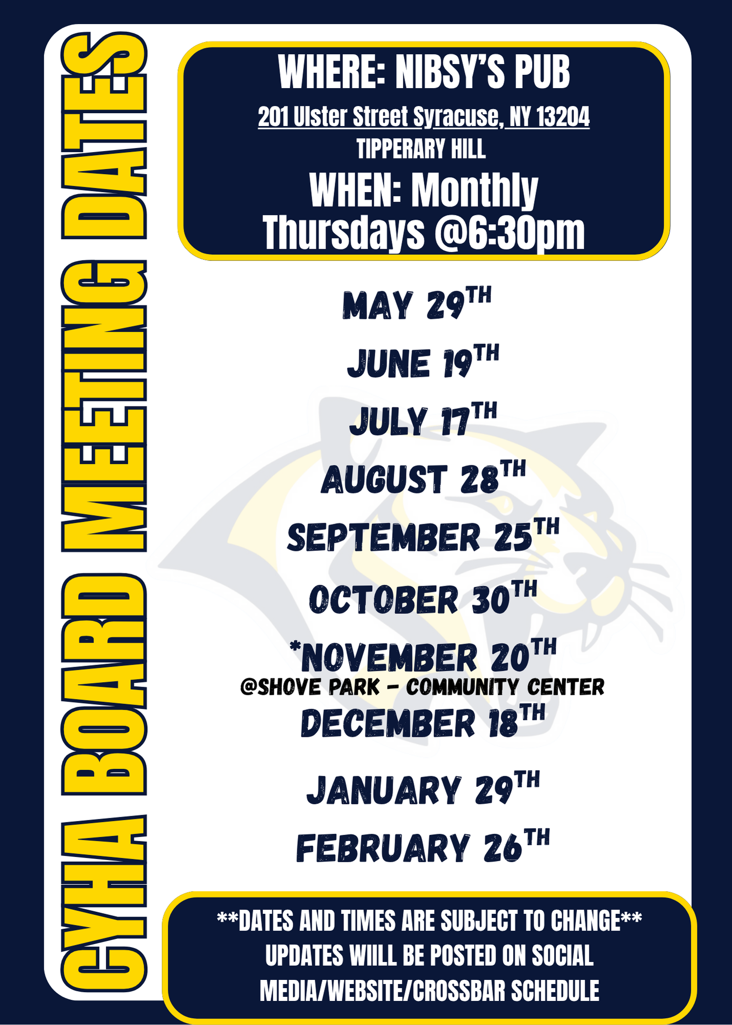 CYHA is governed by a 13-member Board of Directors (“the Board”). Four members are elected annually for a term of 3 years by the general membership of the association at an annual meeting held after the end of the regular hockey season. The West Genesee High School Hockey head coach also holds a non-voting seat on the Board of Directors.